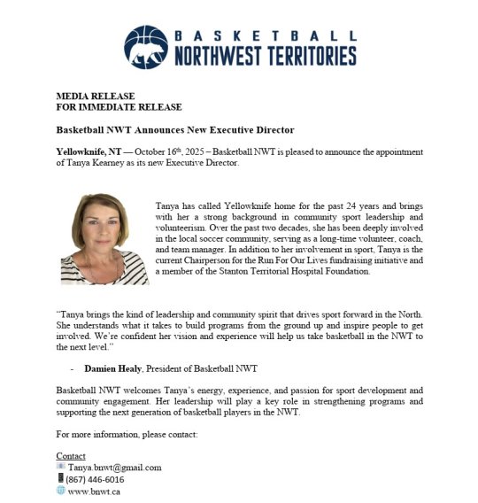 Basketball NWT Announces New Executive Director Yellowknife, NT — October 16th, 2025 – Basketball NWT is pleased to announce the appointment of Tanya Kearney as its new Executive Director.